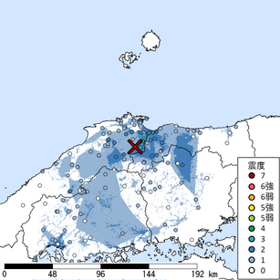[J-RISQ] 2026/01/07 18:43:09 発表(Ver.2) 2026.01.07地震情報 M 4.0 震源地:島根県東部 2026/01/07 18:39頃発生 最大計測震度2.8 WMS:http://www.j-risq.bosai.go.jp/report/wms?triggerid=R-20260107183921&report=0002&ana=00001&service=WMS&version=1.1.1&request=getcapabilities 推定震度分布: J-RISQ 地震速報 トップへ 地震情報