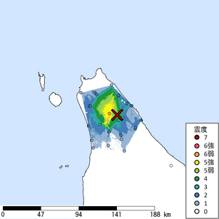 [J-RISQ] 2026/01/12 09:54:23 発表(Ver.7) 2026.01.12地震情報 M 5.0 震源地:宗谷地方南部 2026/01/12 09:50頃発生 最大計測震度5.6 WMS:http://www.j-risq.bosai.go.jp/report/wms?triggerid=R-20260112095031&report=0019&ana=00001&service=WMS&version=1.1.1&request=getcapabilities 推定震度分布: J-RISQ 地震速報 トップへ 地震情報